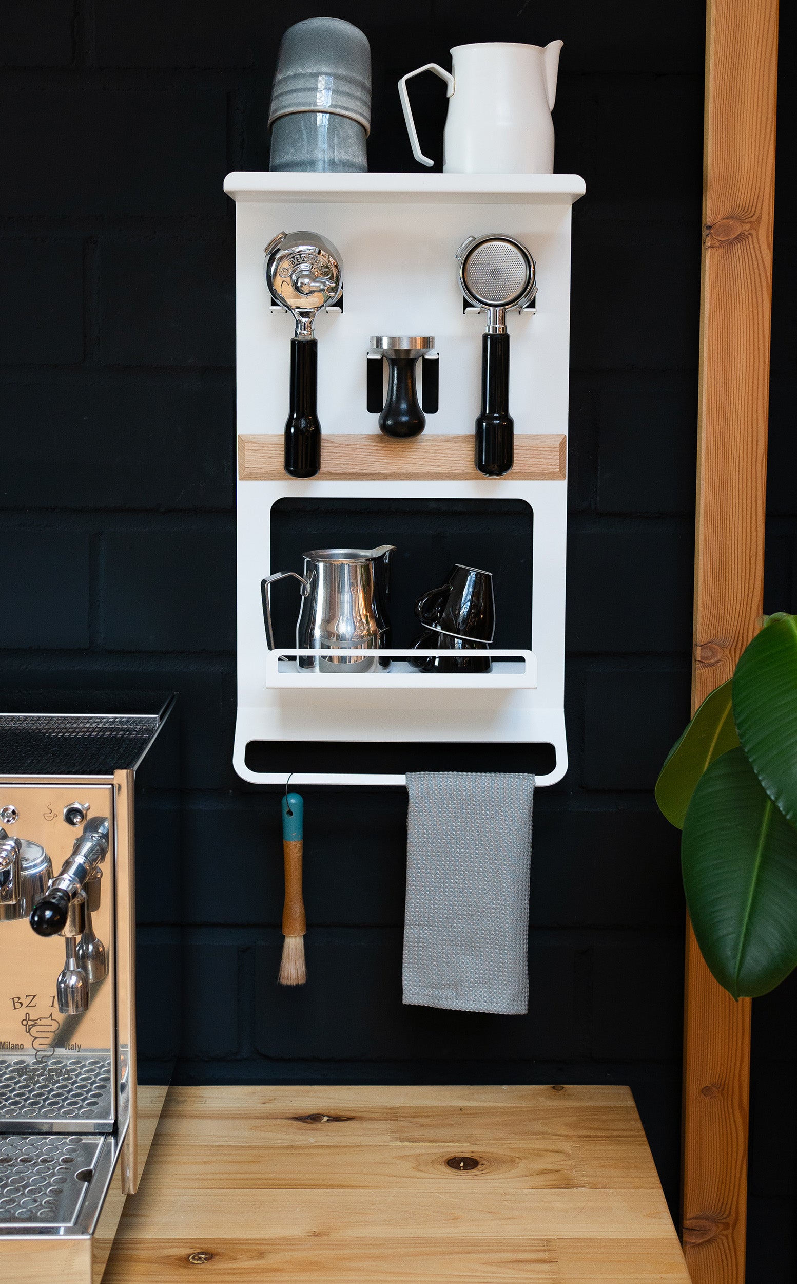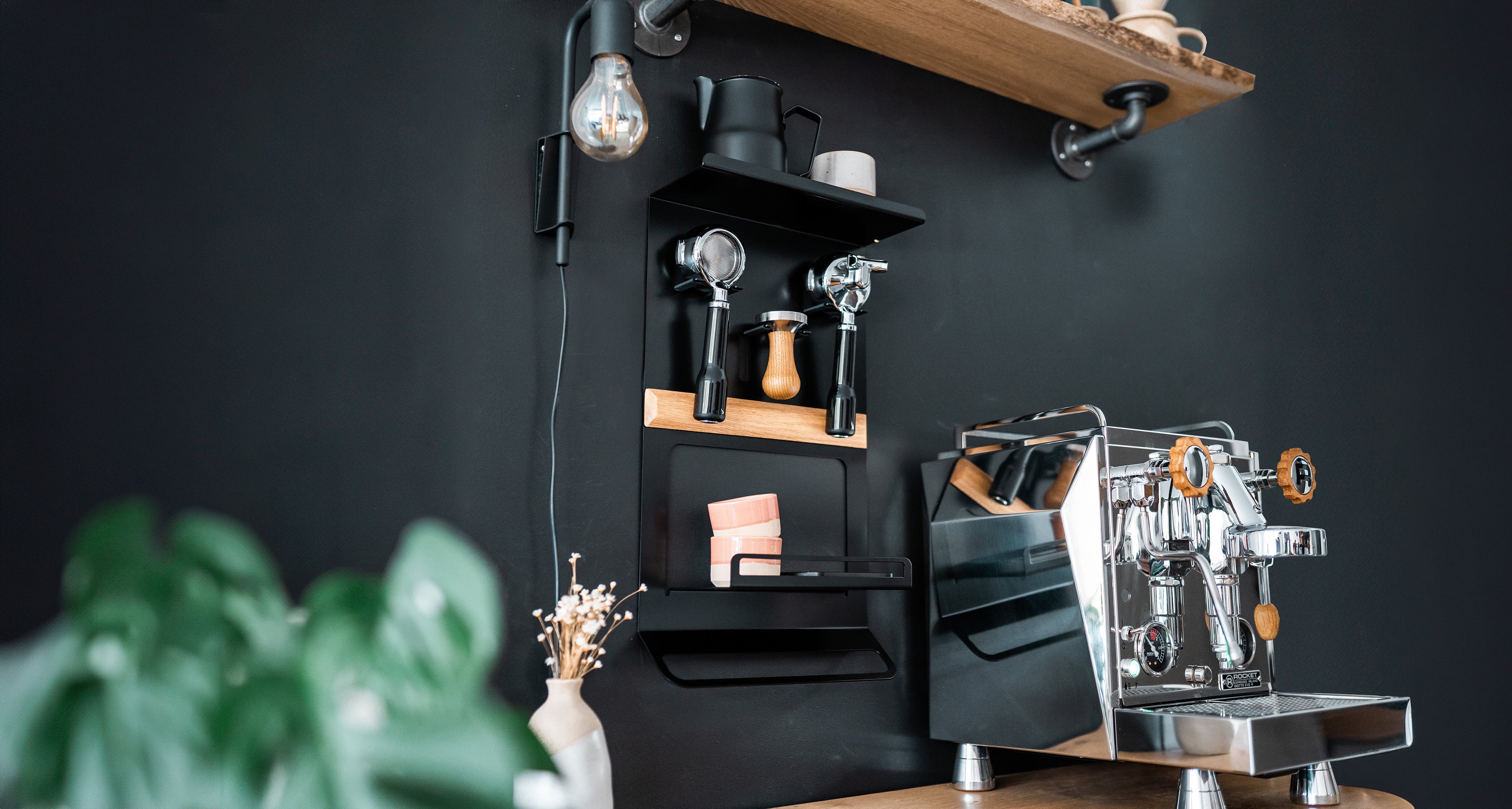 Le mensole FLATE® Barista portano ordine nel vostro bar, indipendentemente dalla macchina o dallo spazio che avete a disposizione. Disponibile in due diverse dimensioni, troverete i supporti e le opzioni di stoccaggio giuste, sia che si tratti di 2 o 3 supporti per tamper o portafiltro, sia che si tratti di un supporto verticale o di un supporto a parete: il ripiano sarà l'aggiunta più importante alla vostra macchina portafiltro, indipendentemente dal produttore.