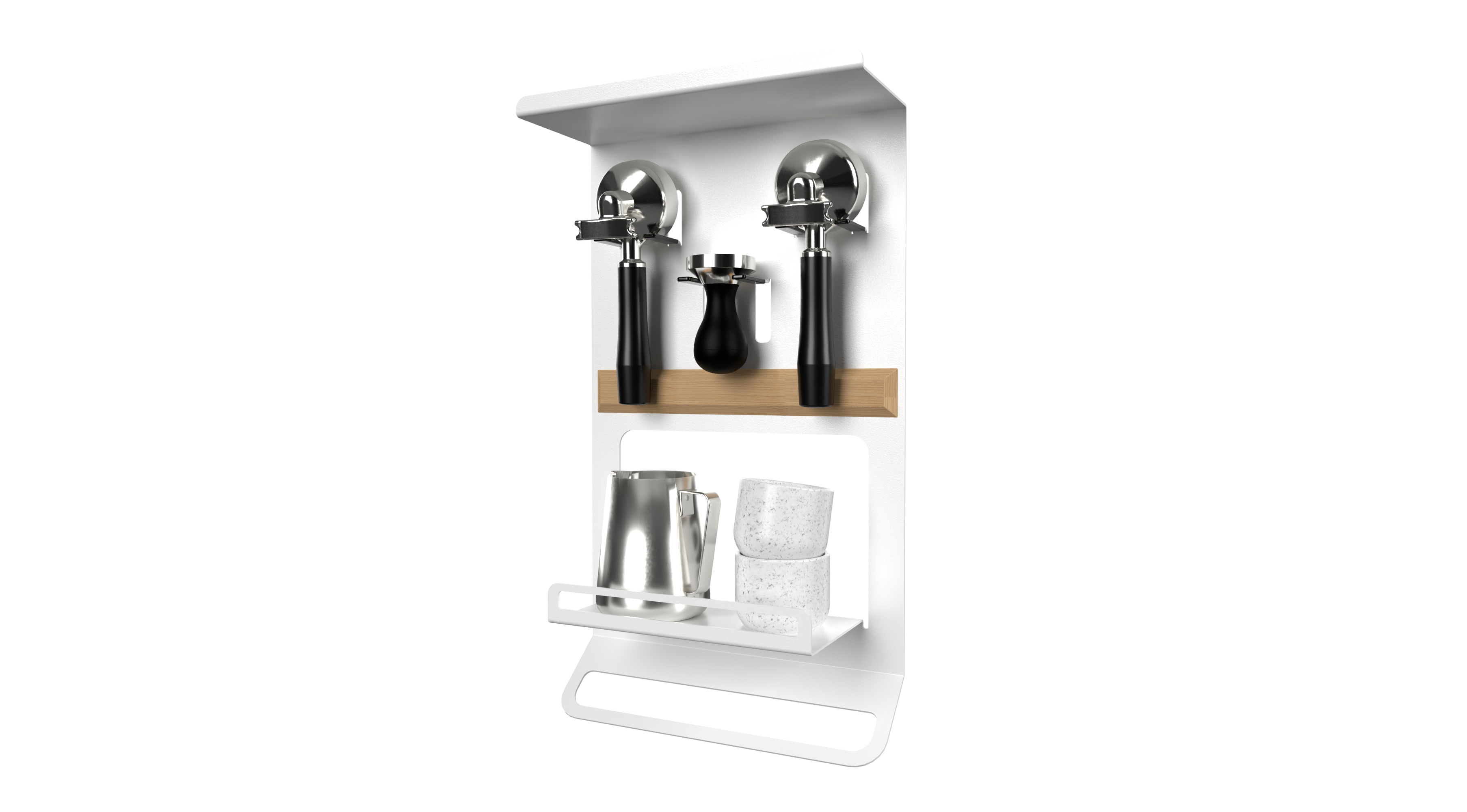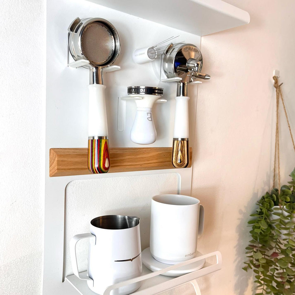 Barista shelf for portafilters, tampers and barista accessories