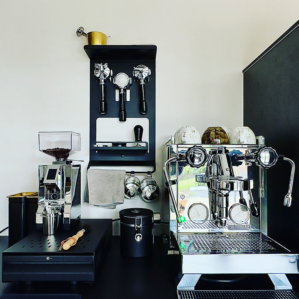 The FLATE® Barista Rack brings order to your coffee bar. With three holders for portafilters, a hanging device for cloths and two storage areas, it is the perfect addition to any espresso machine. Made from powder-coated steel and suitable for all standard portafilter models.