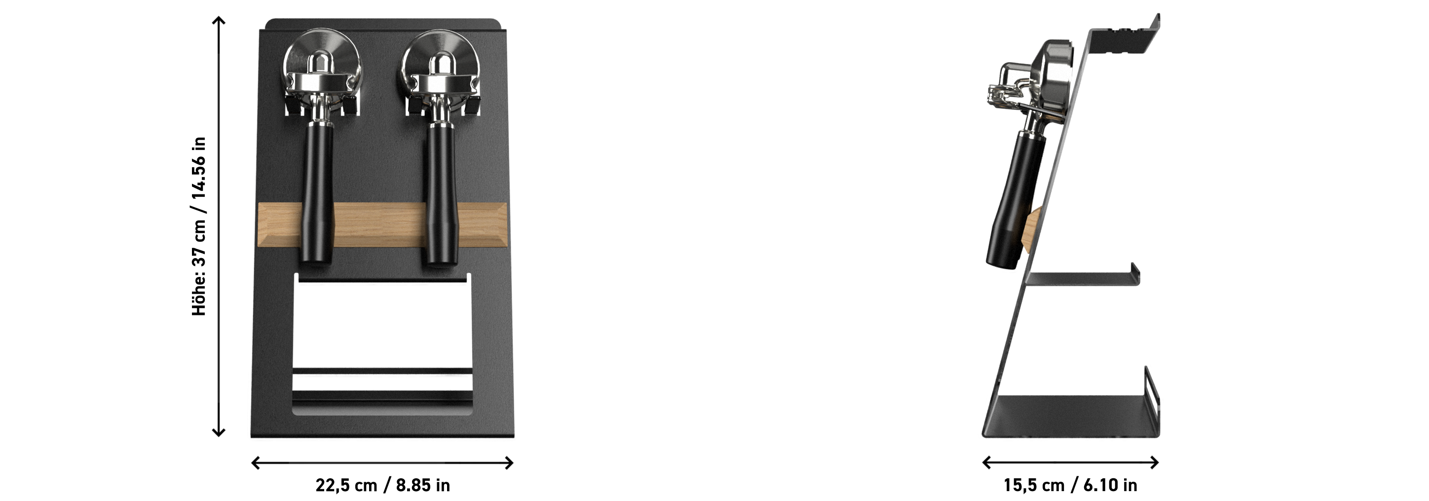 Our FLATE® Barista Station combines compactness with generous space utilisation. Despite being slightly smaller than our wall-mounted shelf, it provides enough room to conveniently organize your essential coffee tools. With its two holders, it's perfect for two portafilters or a portafilter and a tamper, ensuring everything you need is always within reach.