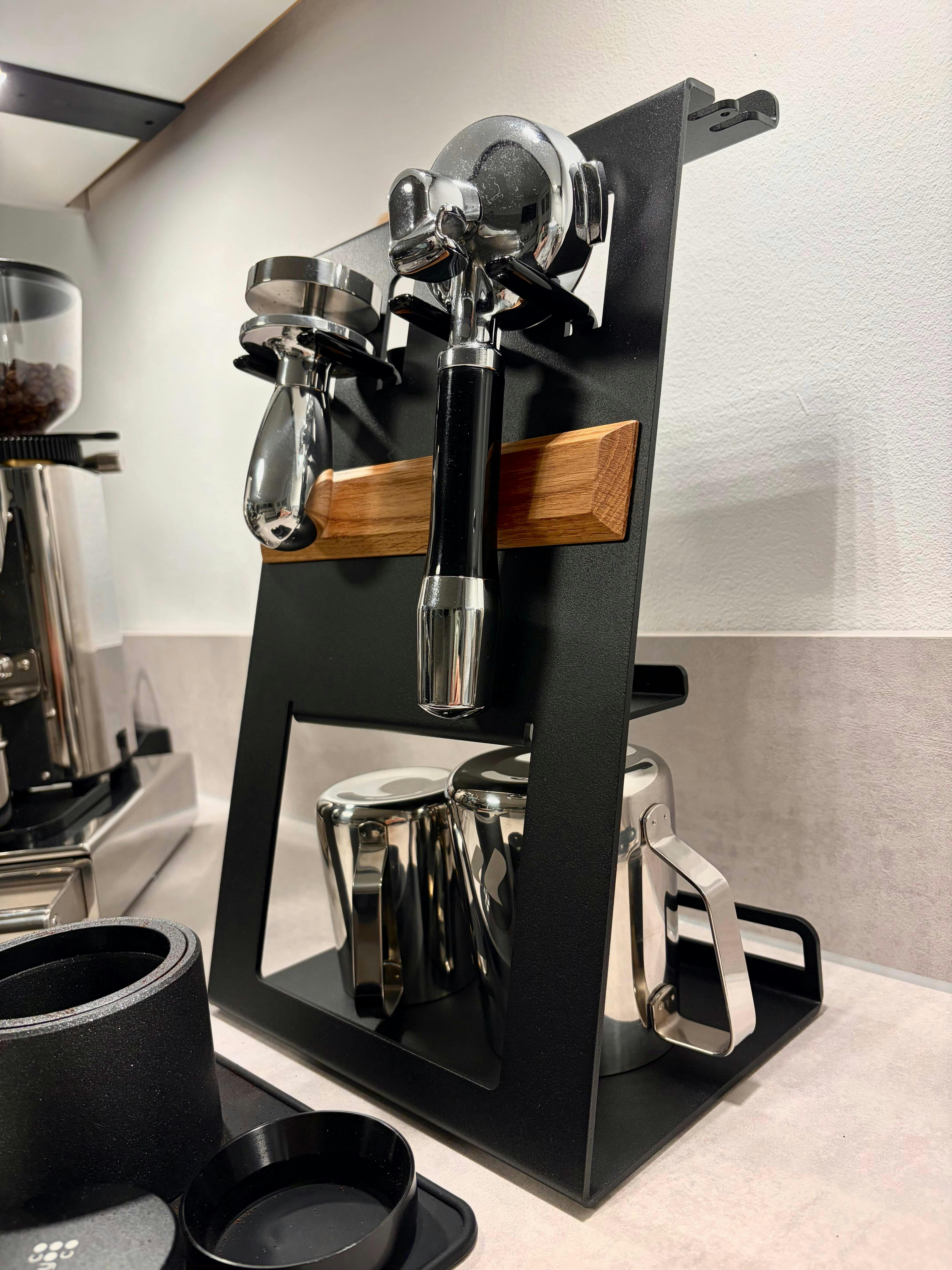 The ideal solution for organizing your coffee corner! Especially for coffee enthusiasts with limited space, it is the perfect companion for your daily coffee routine. This stand is an absolute must-have that sets new standards for organizing your coffee corner and eliminates the need for wall mounting. Our holder is designed to fit all common portafilter models, including E61 machines, Sage, De'Longhi, Bezzera, Rocket, and many more.