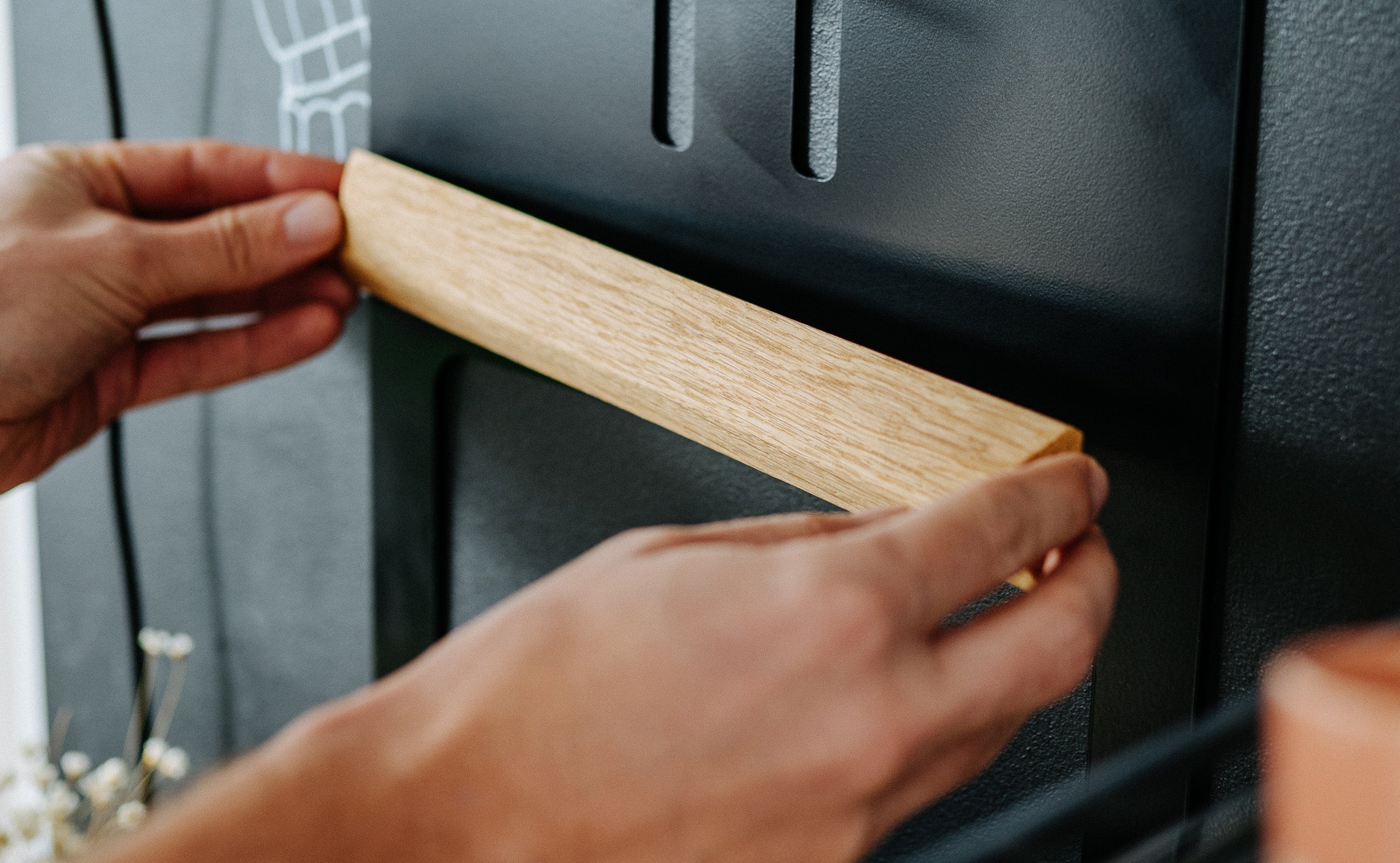La mensola può essere montata alla parete in modo semplice e sicuro utilizzando i tasselli e le viti in dotazione. La striscia di legno magnetica può essere posizionata nella posizione desiderata.